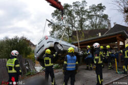 Im Anschluss konnte ein Feuerwehrmann ins Heck des Fahrzeugs einsteigen und gemeinsam konnte die ältere Person aus dem Fahrzeug befreit und dem Roten Kreuz übergeben werden. Im Anschluss wurde der PKW mit dem Kran des Schweren Rüstfahrzeugs geborgen und für den Abschleppdient bereitgestellt. In weiterer Folge musste auch der Carport – dessen Stütze beim Unfall beschädigt wurde – gesichert werden, um einen Einsturz zu verhindern. Nach rund eineinhalb Stunden konnte die FF Schärding wieder ins Feuerwehrhaus einrücken.