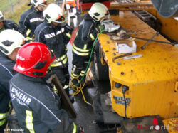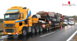 Die Achse lag auf der Fahrbahn auf und musste angehoben werden um den geplatzten Reifen zu wechseln. Das gesamte Gespann hatte ein Gechicht von 115 Tonnen. Das Gewicht der Achse mit dem Reifenschaden lag bei ca. 12 Tonnen. Mittels Hebekissen wurde die Achse langsam angehoben und mit Kanthölzern unterfüttert, sodass der Reifen gewechselt werden konnte. Nach ca. einer Stunde konnte wieder eingerückt werden.