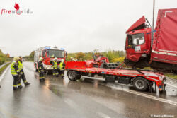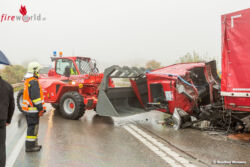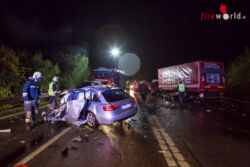 Der Pkw-Lenker war im Wrack eingeklemmt und konnte erst durch den Einsatz von hydraulischem Rettungsgerät durch die Feuerwehrkräfte befreit werden. Aufgrund der Wrackteile, die sich auf weite Teile der vierspurigen Fahrbahn verteilten, wurde ein nachfolgender Pkw zu einem Ausweichmanöver und einer Notbremsung gezwungen, woraufhin er fahrunfähig war. Zuerst wurde dieser Pkw mit dem Wechselladefahrzeug von der Straße gebracht, dann erfolgte der Abtransport des Unfall-Pkws ebenfalls mithilfe des Wechselladefahrzeugs. Mit dem zur Einsatzstelle nachgeforderten Kranfahrzeuges wurde die Bergung des in mehrere Teile zerrissenen Lastwagens begonnen. Mittels Zurrgurten verbanden die Einsatzkräfte die Fahrerkabine wieder mit dem Fahrzeugaufbau, anschließend hoben sie die Fahrzeugteile mit dem Kranfahrzeug auf einen Tieflader und verbrachten sie von der Verkehrsfläche.