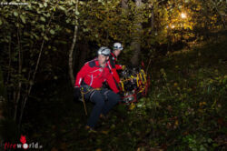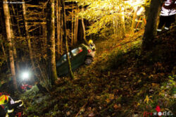 Ein Auto war bei der Talfahrt von der Straße abgekommen und in den angrenzenden Wald gestürzt. Zwei Insassen waren im Fahrzeug eingeschlossen eine dritte Person wurde aus dem Fahrzeug geschleudert. Beim Eintreffen an der Unfallstelle konnte sich der Notarzt einen Überblick über den Schweregrad der verletzten Personen schaffen und eine Prioritätenreihung vornehmen. Gleichzeitig wurden von der Bergrettung ein Seilgeländer und die Gerätschaften zum Abseilen des weiteren Materials für die Personenrettung aufgebaut.