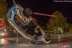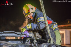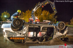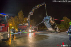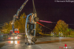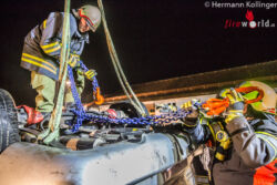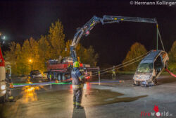 Das auf den Bildern zu sehende Kranfahrzeug durfte nicht aktiv ins Geschehen mit eingebunden werden, es diente ausschließlich zu Sicherungszwecken für die Feuerwehrleute, damit das Auto nicht umstürzen konnte.
