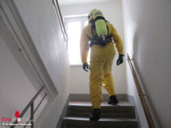 Vor Ort führten die ersten Mannschaften die Erkundung durch und evakuierte die betroffene Wohnung. Schnell stellte sich heraus, dass es sich bei den Dämpfen und Chlorgas handelte. Die vier anwesenden Personen wurden, mit teilweise bereits ausgeprägten Vergiftungserscheinungen, an die anwesenden Rettungskräfte übergeben. Gleichzeitig wurden aus Sicherheitsgründen auch die anderen Parteien des Wohngebäudes geräumt. Aus der Wohnung musste auch eine Katze unter Atemschutz gerettet werden.