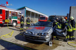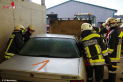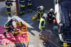 Danach ging es zum eigentlichen Schwerpunkt der Ausbildungsveranstaltung. In insgesamt vier Einsatzübungen mussten die Feuerwehren ihr können bei realistisch nachgestellten Unfallszenarien unter Beweis stellen. Von der Firma Auto Prinz wurden sechs Schrottfahrzeuge zur Verfügung gestellt welche entsprechend verformt wurden um Einklemmungen der Übungspuppen zu simulieren.