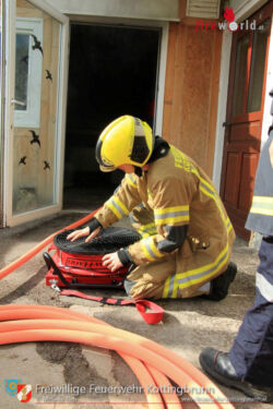 Der Atemschutztrupp des HLF1 wurde zur Brandbekämpfung in das Gebäude geschickt. Der Atemschutztrupp des nachrückenden Tanklöschfahrzeuges stellte inzwischen den Rettungstrupp. Die Mannschaft des Rüstlöschfahrzeuges baute derweil die Wasserversorgung vom Hydranten auf. Hierfür wurde von der Polizei der Verkehr angehalten, da der Hydrant auf der anderen Straßenseite lag.