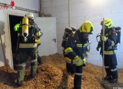 Das vierzig Kubikmeter umfassende Lager musste zur Hälfte händisch ausgeschaufelt werden. Diese kräfteraubende Arbeit war nur unter Einsatz von Atemschutz möglich. Die ausgeräumten Hackschnitzel mussten dann abgelöscht werden.