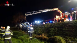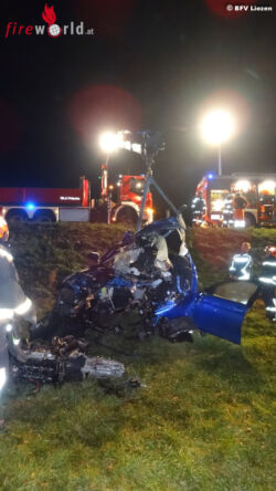 Die Feuerwehren mussten nach Absichern der Unfallstelle und Herstellen eines Brandschutzes den eingeklemmten Verunfallten mittels hydraulischem Rettungsgerät aus dem Wrack bergen; der PKW und Wrackteile wurden mittels Kran geborgen.