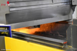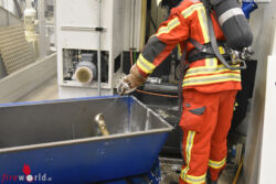 Das erste nach kurzer Zeit eintreffende Löschfahrzeug bestätigte die Meldung und forderte sofort weiteres Sonderlöschmittel Kohlendioxid und Metalbrandlöscher an die Einsatzstelle. Unter Atemschutz wurde mit CO2-Löschern versucht das Feuer zu ersticken was aber keinen effektiven Erfolg hatte. Das Feuer loderte im Öl immer wieder auf. Die Maschine verfügte über eine interne CO2-Löschanlage. Nachdem die Maschine mit dem Brand geschlossen war, wurde diese ausgelöst. Dadurch war der Brand, der sich danach auf das Vorratsbecken des Öls beschränkte nicht ganz gelöscht, aber die Anlage um einiges herunter gekühlt. Um an das Vorratsbecken heran zu kommen, wurde der Elektromotor darüber entfernt. Jetzt konnte gezielt der Behälter mit Kohlendioxid geflutet werden und anschließend das Öl mit der Schleifschlacke entfernt werden. Bürgermeister Andreas Glaser und Fachbereichsleiter Dr. Moritz Heidecker machten sich vor Ort ein Bild über die Einsatzlage.
