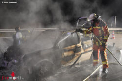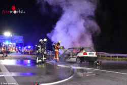 Nur etwa eine halbe Stunde später, gegen 21:07 Uhr wurden die Freiwilligen Feuerwehren aus Forst und Bruchsal zu einem Pkw-Brand auf die Autobahn BAB5 Richtung Süden alarmiert. Beim Eintreffen der ersten Einsatzkräfte, stand ein Pkw auf der mittleren Fahrspur in Folge eines Auffahrunfalls in Vollbrand. Aus bislang ungeklärter Ursache fuhr der Fahrer eines VW Golf auf ein vorausfahrendes Fahrzeug auf und schob zwei weitere Fahrzeuge ineinander. In der Folge fing der VW Golf an zu brennen.