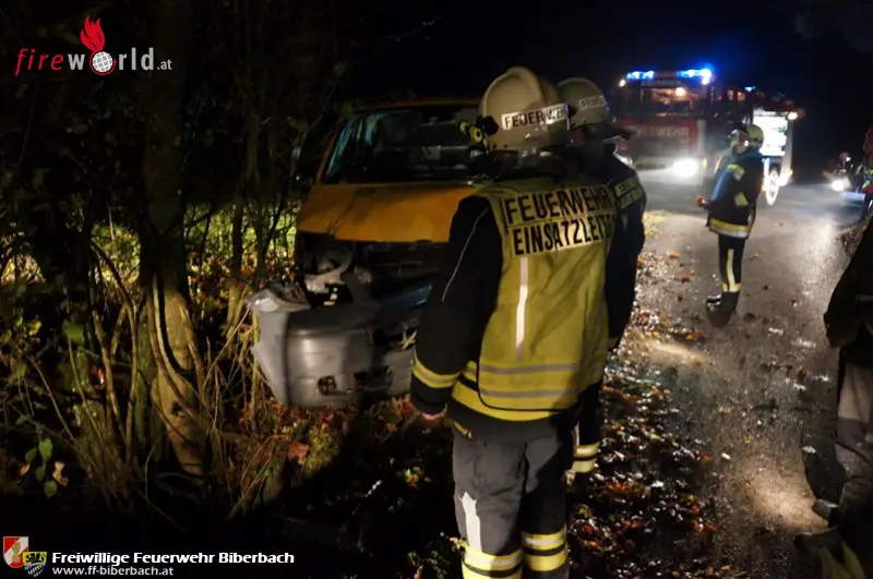 BIBERBACH (NÖ): Am Abend des 8. November 2016 wurden die Kräfte der Feuerwehr Biberbach zu einer Pkw-Bergung auf den Güterweg Kleeberg alarmiert. Nach einem Verkehrsunfall drohte ein Lieferwagen in den Biberbach zu stürzen.