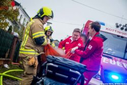 Am Einsatzort angekommen wurde vom Feuerwehr-Einsatzleiter festgestellt, dass sich doch noch drei Personen im Gebäude befanden. Zwei Bewohner konnten das Gebäude selbstständig verlassen, bei der dritten Person handelte es sich um eine bettlägerige ältere Person. Deshalb entschied der Feuerwehreinsatzleiter die Personenrettung mittels Tragetuch vom zweiteintreffenden Gruppenfahrzeug der Feuerwehr Kottingbrunn sofort durchführen zu lassen.