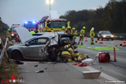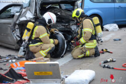 RATINGEN (DEUTSCHLAND): Aus bislang ungeklärter Ursache kam es am Morgen des 13. November 2016 zu einem schweren Verkehrsunfall zwischen zwei Pkw. Aufgrund der Meldung wurden die Standorte der Berufsfeuerwehr und des Löschzuges Breitscheid zu einer eingeklemmten Person alarmiert.