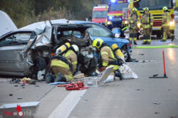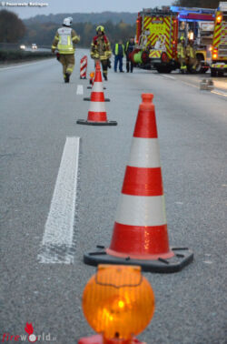 Während der Rettungsarbeiten stellten die Einsatzkräfte einen undichten Gastank an einem der verunfallten Fahrzeug fest. Sofort wurde die Autobahn komplett gesperrt und Sicherungsmaßnahmen eingeleitet. Der undichte Gastank befand sich eingekeilt in dem Fahrzeugwrack und konnte nicht abgedichtet werden.