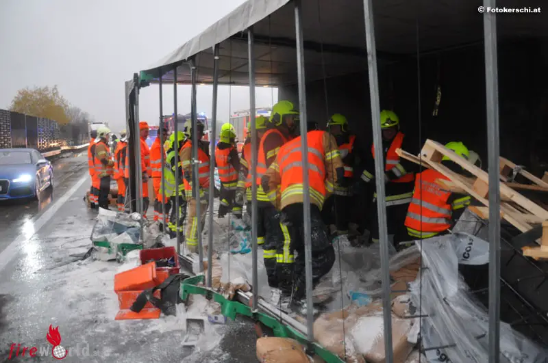 Infolgedessen ist das Fahrzeug umgestürzt. Der schwerverletzte Unfalllenker konnte von der Rettung befreit und ins Krankenhaus gebracht werden. Die geladenen Zementsäcke mussten von der Feuerwehr händisch weggebracht werden. Aufgrund der Aufräumarbeiten musste die Westautobahn gesperrt werden.