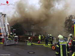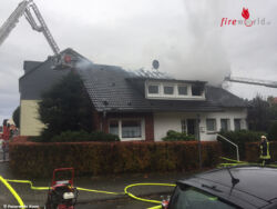 Zwei Atemschutztrupps gingen in das Wohnhaus vor und löschten den Brand im ersten Obergeschoss. Gleichzeitig wurden über die Teleskopbühne von außen Löschmaßnahmen eingeleitet. Zunächst schien das Feuer unter Kontrolle zu sein. Dann allerdings entwickelte sich binnen kurzer Zeit eine starke Rauchentwicklung im Spitzboden des Hauses. Da die Gefahr einer Rauchgasdurchzündung bestand, mussten die Trupps umgehend das Gebäude verlassen. Tatsächlich kam es dann zu der Durchzündung, bei der die Brandgase so stark thermisch aufbereitet waren, dass sie schließlich mit Flammenbildung verbrannten. Dadurch durchschlug das Feuer kurz darauf auch die Dachhaut.