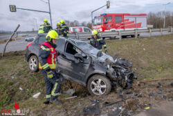 In Folge prallte das Fahrzeug bei der ampelgeregelten Kreuzung mit der B17 zwischen Oeynhausen und Traiskirchen mit voller Wucht fast geradeaus in die Leitschiene. Dabei gaben die Befestigungspunkte nach und der Pkw wurde regelrecht unter der Randleitschiene durchgedrückt. Einige Straßenverkehr-Hinweisschilder riss das Fahrzeug ebenfalls mit, als dieses im Graben zwischen der B17 und der Auffahrtsrampe der A2 Richtung Wien zum Stillstand kam. Andere Fahrzeuglenker die den Unfall mitbekamen hielten an und eilten zu dem total deformierten Unfallwrack. Obwohl das Fahrzeugdach des Peugeot 308 bei dem Aufprall durch die Leitschiene stark in die Fahrgastzelle eingedrückt wurde, konnten die Ersthelfer den Lenker aus dem Unfallwrack befreien. Und das sogar laut Erstinformationen vor Ort, nur mit leichten Verletzungen.