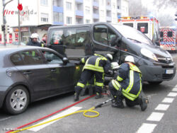 Nach einem Verkehrsunfall waren sechs Personen in einem Kleinbus eingesperrt. Die Fahrzeuge hatten sich mit der Stoßstange/ Seitenleiste stark deformiert und verkeilt . Die Feuerwehr hob mit einem hydraulischen Rettungsgerät ein Fahrzeug an.