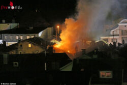 BAD REICHENHALL (BAYERN): Am Donnerstagabend, 8. Dezember 2016, gegen 21.10 Uhr mussten Feuerwehr, Rotes Kreuz und Polizei in die Tiroler Straße ausrücken, wo im Innenhof mehrerer, direkt aneinander angrenzender Altbauten die Rückseite eines Gebäudes in Vollbrand stand und das Feuer bereits vom Balkon auf den Dachstuhl übergriff.