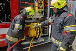 Setzen wir unseren Rundgang fort, klettern wieder vom Dach und erreichen den Geräteraum 6, also den hintersten auf der Beifahrerseite. Wie schon Geräteraum 3 widmet sich auch dieser primär der Thematik „Löschen“. Feuerlöscher für verschiedene Klassen, Schaummittel und Rollschläuche sind hier neben weiteren zwei B-Abgängen und einem vorbereiteten Schnellschaumangriff platziert. Um nicht dreckig nach Hause fahren zu müssen oder auch einen Imbiss mit sauberen Händen genießen zu können, findet sich in diesem Raum das bei neuen Einsatzfahrzeugen schon standardisierte Hygienebord samt Druckluftanschluss. Den Abschluss macht ein Sprühgerät zum Auftragen von Bioversal bei Ölverunreinigungen auf Verkehrsflächen.
