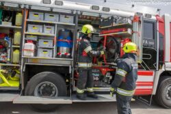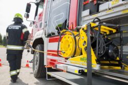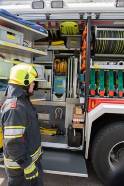 Werfen wir einen Blick auf den Geräteraum 1, also jenem fahrerseitig vorne. Dieser ist überwiegend der Thematik „Retten und Bergen“ gewidmet. Hier finden beispielsweise auf einer Auszugswand beispielsweise ein zweiteiliges Hebekissenset (also Kissen und Zubehör). Dieses ist so ausgeführt, dass die Einheiten tragbar sind. „Je ein Mann entnimmt diese beiden Kisten mehr oder weniger wie eine Tasche und bringt sie so komplettiert zum unmittelbaren Ort des Bedarfs“, erklärt Michael Baumann, der auch in der Arbeitsgruppe mitgewirkt hat. „Auch beim im gleichen Raum situierten hydraulischen Rettungsgerät haben wir eine kleine Änderung vorgenommen. Der Schlitten ist nun so ausgeführt, dass das Gerät am Drehfach zusätzlich drehbar ist. Somit ist ein Mann in der Lage, das Rettungsgerät entlang des Fahrzeuges in Richtung Unfallfahrzeug zu ziehen, ohne dass er zusätzlich jemanden braucht, der ihn bei der Schlauchführung unterstützt.“ Ebenfalls in diesem Raum befinden sich die neuen Unterlegmaterialien (Stabfast, Stabpack), das Spineboard, verschiedenste Schäkel und Anschlagmaterialien, Türöffnungsset, Unfallkiste, Druckluftanschluss samt Schlauch und „Pistole“, Absicherungsmaterial und dergleichen. Sichtbar ist hier auch die Rettungsplattform (fälschlicherweise oft als Lkw-Rettungsplattform bezeichnet, wenngleich dieses Utensil einen viel breiteren Anwendungsbereich bietet). Entnommen werden kann sie jedoch – bewusst – nur vom gegenüberliegenden Geräteraum G2. Unter anderem der Grund: Vermeidung von „Personalstau“, wenn beispielsweise bei einer eingeklemmten Person sämtliches Gerät nur aus einem Raum zu entnehmen ist.