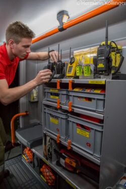 Der Nachbar von Geräteraum 6 ist der nun in der Fahrzeugmitte befindliche Raum 4. Er widmet sich vor allem dem Bereich „Schadstoffe“. Untergebracht sind hier in handlichen Kisten, die übrigens wie alle auch beschriftet sind und somit auch bei weniger ausgeprägten Kenntnissen wieder an ihre richtige Stelle zurückgebracht werden können, beispielsweise Ölbindemittel, -vlies, Wassersauger, Schachtabdeckungen, Keile, Chemieschutz, Auffangwanne, Abdeckplanen, Müllsäcke und dergleichen. Im Gegensatz zum gegenüberliegenden Geräteraum war hier jedoch klarerweise eine Aufstiegshilfe notwendig. Diese konnte durch den klappbaren Kotflügel geschaffen werden.