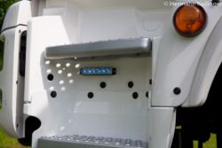 Hinsichtlich der optischen Signaleinrichtung wurde die Standausführung mit vorne und hinten jeweils oben am Dach etwas erweitert. „Wir kämpfen immer wieder mit der Sichtbarkeit, vor allem beim Ausfahren beim Feuerwehrhaus“, weiß Michael Baumann von der Feuerwehr. „Aus diesem Grund haben wir sowohl im Kühlergrill zwei LED-Blitzer, am Heck hinten zwei LED-Blitzer sowie bei den vorderen Einstiegen je einen LED-Blitzer anbringen lassen.“ Hinsichtlich der Akustik hat man auf ein originales Martinshorn zurückgegriffen.
