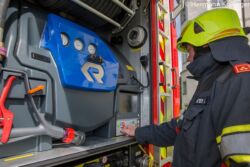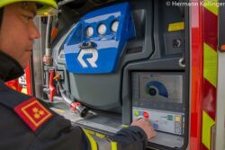 Das Herz dieses Raumes ist das Bediendisplay. Hier war der Autor des Beitrages lange selbst von einer recht kritischen Einstellung begleitet, was die Bedienungen selbiges betrifft. Doch die Praxis sieht nun nach dem ersten Test völlig anders aus. „Nach der Schulung am Computer wusste ich schon, was mich erwarten würde“, so Hermann Kollinger, Feuerwehrmann und Autor. „Die Nutzerführung ist denkbar einfach. Einschalten und die Pumpe schaltet sich ein, saugt automatisch und stellt den Betriebszustand her. Was will ich jetzt? Die Entscheidung, ob Wasser einfüllen oder Wasser raus führt sofort ins nächste, grafisch aufbereitete Menü und mit einem Klick habe ich Wasser am Schnellangriff. Gas geben und bei Bedarf gewünschten Druck einstellen und die Sache läuft!“. Ebenso von hinten bedienbar sind der Stromgenerator, der übrigens zum Betrieb des ausfahrbaren Lichtmastes (ebenso vom Display bedienbar und mit acht Stück 42 Watt LED-Lampen ausgestattet) nicht erforderlich ist, eben der Lichmast und die Umfeldbeleuchtung.