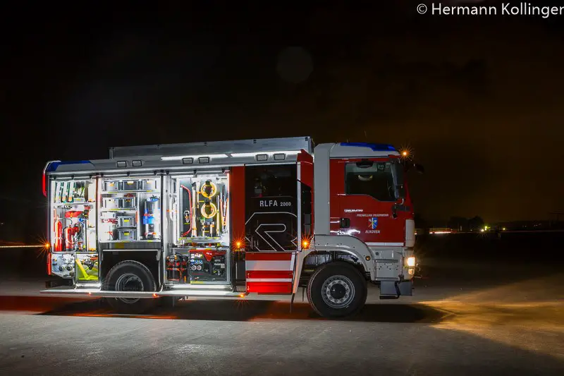 Eines sei bei der Konzeption des Fahrzeuges auch erwähnt. Die Feuerwehr Alkoven hat als zweite wasserführende Einheit ein Tanklöschfahrzeug (TLF-A 4000) im Fuhrpark. Dieses ist klarerweise speziell für den Branddienst ausgeführt und ausgerüstet (200 l fixer Schaumtank, Wasserwerfer und dergleichen). Daher übernimmt das nnun beschaffte Rüstlöschfahrzeug in erster Linie den technischen Part und ergänzt den Brandeinsatz als zweites Fahrzeug und ist primär für die Kombination mit der Teleskopmastbühne vorgesehen.