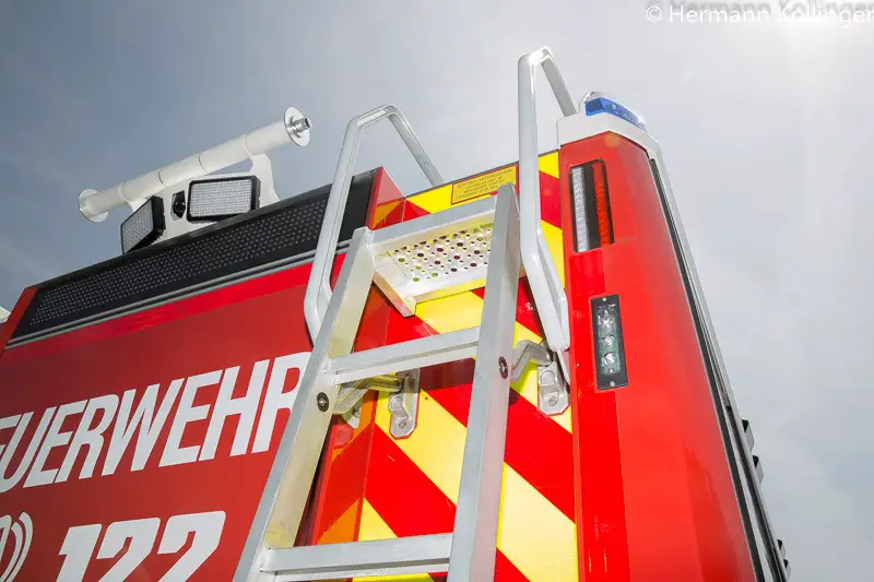 Die Ausfahrtsproblematik am derzeit noch aktuellen Standort des Feuerwehrhauses direkt an der B 129 veranlasste das Team auch, unter den Einstiegen links und rechts vorne Blaulichtblitzer anbringen zu lassen. Als weiteres Beispiel sei an dieser Stelle auch noch die Entscheidung für das 18-Tonnen-Fahrgestell anstatt der häufig verwendeten 15- oder 16-Tonner erwähnt. Dies geschah in Hinblick auf die Tatsache, dass das Fahrzeug – im Gegensatz zu den meisten Fahrzeugen in der Wirtschaft – Woche für Woche, Jahr für Jahr mit voller Beladung am Gewichtslimit in der Garage steht. Eine weiterer Blick voraus war die Möglichkeit, dass das vom Verband vorgeschriebene, maximale Einsatzgewicht von 15 Tonnen mit der Zeit doch einmal angehoben wird und somit auch hier noch Reserven bestehen und nicht von Beginn an das Maximum erreicht ist. Vom Radstand her fiel die Wahl auf das Modell mit 3.900 mm. „Das vor allem um Platz für die Rettungsplattform zu haben“, erklärt Markus Unter. „Das ebenso verfügbare 4.200 mm Modell kam für uns aufgrund des großen Wendekreises, des zusätzlichen Gewichts etc. nicht in Frage!“ Reifentechnisch griff man zugunsten der Traktion auf das breiteste Modell zurück, wenngleich man sich auch den Nachteilen – beispielsweise bei Spurrillen – bewusst ist.