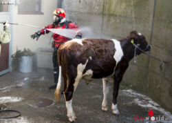 Ausgerüstet mit Schutzanzug und Atemschutz stiegen zwei Feuerwehrmänner in die Grube und brachten das Tierhebenetz an, mit welchem der Stier sodann sicher und schonend gerettet werden konnte. Das Reinigungsgerät war bereitgestellt, und so freuten sich nach der erfolgreichen Rettung wohl der Gerettete wie auch die beiden Retter gleichermassen über die Dusche mit warmem Wasser.