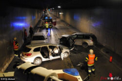 Aus unbekannter Ursache kollidierten ca. 1,5 km nach dem nördlichen Tunnelportal drei Pkw, wodurch drei Personen leicht verletzt wurden. Seitens der Feuerwehr wurden die Unfallfahrzeuge abgesichert und ein präventiver mehrfacher Brandschutz aufgebaut. Die Verletzten konnten sich selbstständig aus den Fahrzeugen befreien. Durch den Unfall kam es zum Austritt einer geringen Menge an Betriebsmitteln, die unmittelbar von den Einsatzkräften gebunden wurde. Für die Dauer des Einsatzes musste die gesamte Tunnelröhre gesperrt werden.