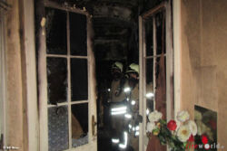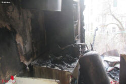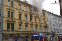 Parallel dazu wurde das Stiegenhaus rauchfrei gemacht, gesichert. Danach wurden die im dritten Obergeschoss befindlichen Brandwohnungen auf Verrauchung geprüft. Dabei zeigte sich, dass trotz des schnellen Eingreifens der Berufsfeuerwehr, der Brand sich auch schon über die Brandwohnung hinaus in Wohnungen des 3. Obergeschosses ausgebreitet hatte. Die Brandweiterleitung in das 3. Obergeschoß erfolgte durch abströmende heiße Brandgase sowie durch direkten Flammenüberschlag.