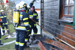 Somit war klar, dass es sich beim Einsatz um ein problematisches Szenario handeln könnte. Bereits bei der Anfahrt erfolgte die Ausrüstung mit schwerem Atemschutz. Am Einsatzort angekommen, wurde von Einsatzleiter BM Gernot Resch der Brand eines Geräteschuppens, der direkt an ein Wohngebäude angebaut ist, festgestellt. Sofort wurde die Vornahme zweier Hochdruck-Strahlrohre aus dem Tanklöschfahrzeug Schwanberg unter Atemschutz befohlen. Erste Löschversuche der Bewohner mit einem Gartenschlauch und Pulverlöschern hatten in der Zwischenzeit die Brandausbreitung deutlich verlangsamt.