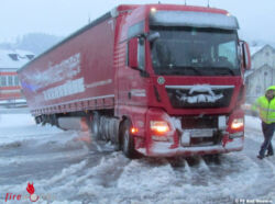BAD GOISERN (OÖ): Zwei Seilwinden musste die FF Bad Goisern einsetzen, um einen Sattelzug bei der Goiserer Ortszufahrt zu bergen. Der Lenker war am Morgen des 28. Dezember 2016 mit seinem Schwerfahrzeug vom Ortszentrum in Richtung Kreisverkehr unterwegs, als er aufgrund von Schneematsch von der Fahrbahn rutschte.