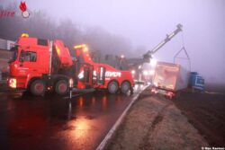 WALDING (OÖ): Am Donnerstag den 29. Dezember 2016, kurz vor 5 Uhr, hat gefrierender Regen in Walding einen Lkw-Unfall verursacht. Der Sattelzug kam auf der glatten Fahrbahn ins schleudern und in weiterer Folge von der Straße ab. Die Freiwillige Feuerwehr Walding war fünf Stunden mit der Bergung beschäftigt.