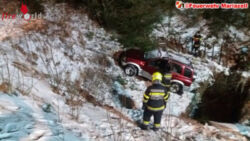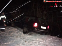 Zum Glück wurde das Fahrzeug von Sträuchern und Ästen aufgehalten, sonst wäre es über einen Abgrund in den angrenzenden Bach gestürzt. Der Fahrer blieb unverletzt. Der Pkw konnte mittels SRF-Seilwinde wieder zurück auf die Straße gezogen werden.