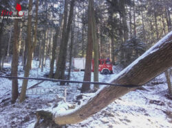 PAYERBACH (NÖ): Am 29. Dezember 2016 wurde die Freiw. Feuerwehr Payerbach um die Mittagszeit zu einer technischen Hilfeleistung – Baum auf Stromleitung, Zufahrtsstraße zu Kreuzberg 1 – alarmiert. Das Sturmtief Barbara dürfte zwei Tage zuvor den Baum entwurzelt haben.
