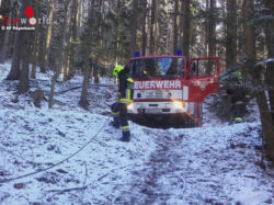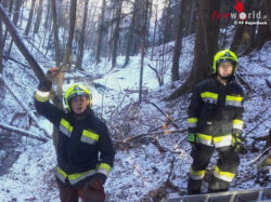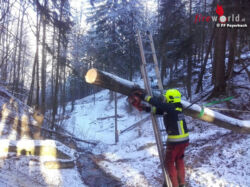 Das Gewächs fiel über die EVN Stromleitung auf die andere Seite des Hanges, sodass er dann auf beiden Seiten auflag. "Wir befestigten auf einem Baum eine Umlenkrolle, damit wir mit der Seilwinde den entwurzelten Baum nach oben sicheren konnten und die Stromleitung entlasteten", informiert die Wehr. Danach wurde der Baum Stück für Stück bis zur Stromleitung abgetragen. Zum Schluss wurde dann der Rest des Baumes mit der Seilwinde von der Leitung gehoben und auf die Seite gelegt.