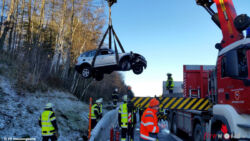 Die augenscheinlich nur leicht verletzte Beifahrerin wurde ohne Schwierigkeiten durch die leicht zu öffnende Beifahrertüre gerettet und konnte das Auto mit Unterstützung der Einsatzkräfte über die Rettungsplattform verlassen. Nach dem Binden von ausgetretenen Betriebsmitteln und dem Aufstellen eines Elementes der Betonleitwand konnte das Unfallfahrzeug mit dem Kran des Wechselladefahrzeugs verladen, abtransportiert und gesichert abgestellt werden.