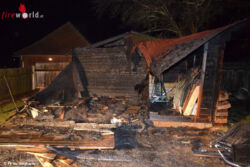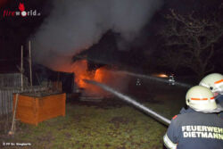 Laut Alarmierung B2 wurde zeitgleich die Feuerwehr Dietmanns mitalarmiert. Bei der Ankunft bot sich folgende Lage: Der Besitzer hatte den Brand bemerkt und alarmierte über Notruf die Einsatzkräfte. Die Gartenhütte stand in Vollbrand. Einsatzleiter HBI Reegen gab den Befehl unter Atemschutz zur Brandbekämpfung. Es wurden zwei C-Rohre vom HLF in Stellung gebracht. Die Beleuchtung der Einsatzstelle sowie eine Einsatzleitung wurde aufgebaut.