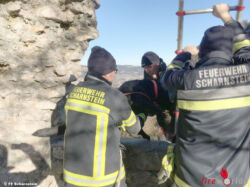 Als die Besitzer Nachschau hielten, entdeckten sie ihren völlig geschockten Hund auf dem zirka 3 Meter tiefer liegenden Podest der Burgkapelle. Die alarmierten Feuerwehrmänner aus Scharnstein konnten den Hund mithilfe einer Teleskop-Leiter aus seiner Notlage befreien und den Hund unverletzt bergen.