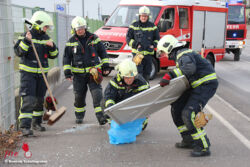 Sturmböen rissen einen Verkehrsspiegel ab, welcher in weiterer Folge auf den Radweg stürzte und in unzählige kleine Glassplitter zersprang. Durch die Wucht des Aufpralles waren die Splitter bis zu 30 Meter auf dem Radweg bzw. auf der Fahrbahn verteilt. Zum Glück befanden zu diesem Zeitpunkt keine Personen am Radweg. Mittels Straßenbesen wurden die Glassplitter zusammengekehrt und im Altstoffsammelzentrum fachgerecht entsorgt. Nach rund einer Stunde war der Einsatz beendet und die 14 Mitglieder konnten mit ihren drei Fahrzeugen wieder ins Feuerwehrhaus einrücken.