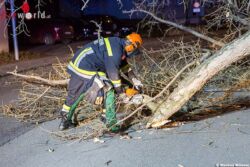 In der Symalenstraße war ein Baum auf einen parkenden Pkw gestürzt. Die Mannschaft des ersteingetroffenen Hilfeleistungsfahrzeugs zerkleinerte mit Kettensägen den auf die Straße ragenden Teil des Baumes und legte die einzelnen Baumstücke am Straßenrand ab.