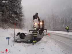BAD ISCHL (OÖ): Zu Mittag des 4. Jänner 2017 wurde der 1. Bereitschaftszug der Hauptfeuerwache Bad Ischl zu einer Fahrzeugbergung auf der B145 in der sogenannten Kalkwerkskurve alarmiert. Ein Fahrzeuglenker kam mit seinem Fahrzeug aus bisher unbekannter Ursache von der Fahrbahn ab, und überschlug sich dabei.