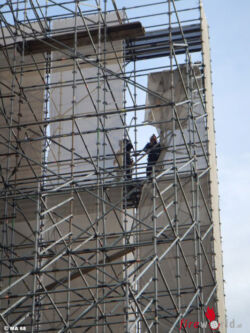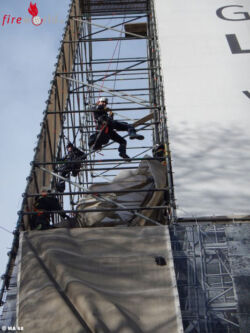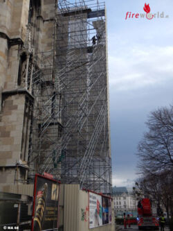 Von den Höhenrettern der Berufsfeuerwehr Wien wurden zwei Bahn (3 x 15 m) des Gerüstplakates entfernt und gesichert abgelegt. Darüber hinaus wurden weitere Plakatteile mittels Draht im erforderlichen Ausmaß am Gerüst gesichert.