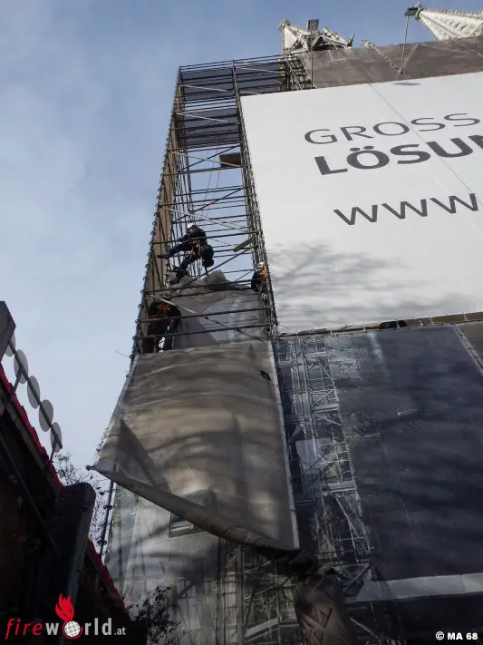 Von den Höhenrettern der Berufsfeuerwehr Wien wurden zwei Bahn (3 x 15 m) des Gerüstplakates entfernt und gesichert abgelegt. Darüber hinaus wurden weitere Plakatteile mittels Draht im erforderlichen Ausmaß am Gerüst gesichert.