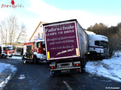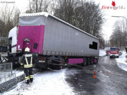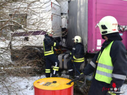 GRAFENSCHACHEN (BGLD): Am Vormittag des 05.01.2017 wurde die Feuerwehr Pinkafeld zu einem G2 (Dieselaustritt 1000l) nach einem Lkw-Unfall nach Grafenschachen nachalarmiert. Ein Sattelzug hatte auf der schneeglatten Fahrbahn die Kontrolle verloren, kam von der Fahrbahn ab, kollidierte mit einem Telefonmasten, durchbrach eine Zaunmauer und kam auf einer Wiese zum Stehen.