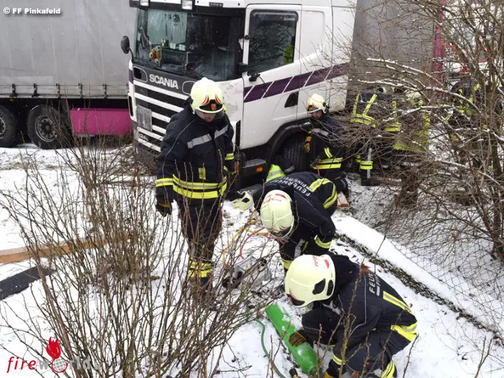 GRAFENSCHACHEN (BGLD): Am Vormittag des 05.01.2017 wurde die Feuerwehr Pinkafeld zu einem G2 (Dieselaustritt 1000l) nach einem Lkw-Unfall nach Grafenschachen nachalarmiert. Ein Sattelzug hatte auf der schneeglatten Fahrbahn die Kontrolle verloren, kam von der Fahrbahn ab, kollidierte mit einem Telefonmasten, durchbrach eine Zaunmauer und kam auf einer Wiese zum Stehen.