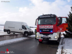 WAIDHOFEN AN DER THAYA (NÖ): hp P1050004Nachdem ein Lieferwagen führerlos über einen Parkplatz gerollt und auf einem Betonsockel hängen blieb, wurde um 12:10 Uhr des 5. Jänner 2017 die Feuerwehr Waidhofen/Thaya zur Bergung in die ÖAMTC-Straße alarmiert.
