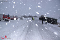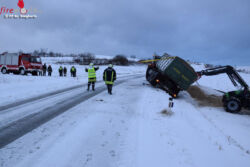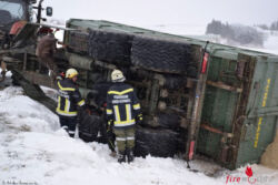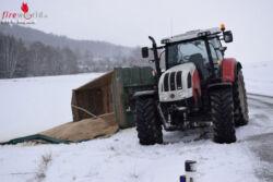 Ein Traktor mit einem großen Anhänger war von der glatten Fahrbahn abgekommen, wobei der Anhänger im angrenzenden Feld seitlich zu liegen kam. Die zuständige Feuerwehr Loibes war bereits vor Ort und hatte gemeinsam mit der Polizei die Unfallstelle abgesichert. Es herrschte Schneetreiben. Das Ladegut des Anhängers lag schon auf dem Feld. Mit den Seilwinden des TLF Loibes und SRF Gr. Siegharts konnte der Anhänger aufgestellt und wieder auf die Fahrbahn gestellt werden. Während der Bergarbeiten wurde der Verkehr durch die Polizei angehalten.