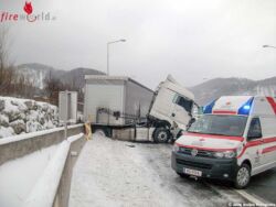 KLAUS (OÖ): Ein Lkw krachte am 5. Jänner 2017 auf der A 9 (Pyhrnautobahn, Gemeinde Micheldorf) gegen die Betonmittelleitwand. Dies führte zu einer Sperre der Autobahn für rund drei Stunden.